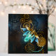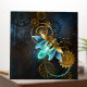 Steampunk firefly with blue transparent wings and green light bulb on worn, brown, textured background. Steampunk style.