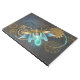 Steampunk firefly with blue transparent wings and green light bulb on worn, brown, textured background. Steampunk style.