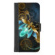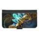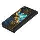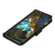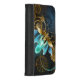 Steampunk firefly with blue transparent wings and green light bulb on worn, brown, textured background. Steampunk style.