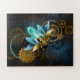 Steampunk firefly with blue transparent wings and green light bulb on worn, brown, textured background. Steampunk style.