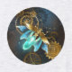 Steampunk firefly with blue transparent wings and green light bulb on worn, brown, textured background. Steampunk style.