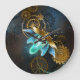 Steampunk firefly with blue transparent wings and green light bulb on worn, brown, textured background. Steampunk style.