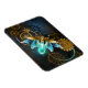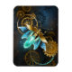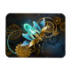 Steampunk firefly with blue transparent wings and green light bulb on worn, brown, textured background. Steampunk style.