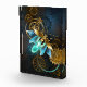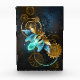 Steampunk firefly with blue transparent wings and green light bulb on worn, brown, textured background. Steampunk style.