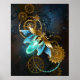 Steampunk firefly with blue transparent wings and green light bulb on worn, brown, textured background. Steampunk style.