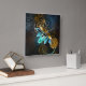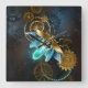Steampunk firefly with blue transparent wings and green light bulb on worn, brown, textured background. Steampunk style.
