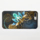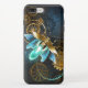 Steampunk firefly with blue transparent wings and green light bulb on worn, brown, textured background. Steampunk style.