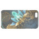 Steampunk firefly with blue transparent wings and green light bulb on worn, brown, textured background. Steampunk style.