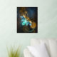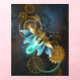 Steampunk firefly with blue transparent wings and green light bulb on worn, brown, textured background. Steampunk style.