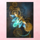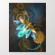 Steampunk firefly with blue transparent wings and green light bulb on worn, brown, textured background. Steampunk style.