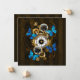 Composition of round steampunk clock with black Roman numeral dial, decorated with gold and brass gears, blue Morpho butterflies and damaged lenses on brown striped background. Steampunk style.