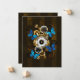 Composition of round steampunk clock with black Roman numeral dial, decorated with gold and brass gears, blue Morpho butterflies and damaged lenses on brown striped background. Steampunk style.