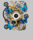 Composition of round steampunk clock with black Roman numeral dial, decorated with gold and brass gears, blue Morpho butterflies and damaged lenses on brown striped background. Steampunk style.