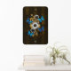 Composition of round steampunk clock with black Roman numeral dial, decorated with gold and brass gears, blue Morpho butterflies and damaged lenses on brown striped background. Steampunk style.