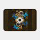 Composition of round steampunk clock with black Roman numeral dial, decorated with gold and brass gears, blue Morpho butterflies and damaged lenses on brown striped background. Steampunk style.
