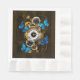 Composition of round steampunk clock with black Roman numeral dial, decorated with gold and brass gears, blue Morpho butterflies and damaged lenses on brown striped background. Steampunk style.