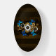 Composition of round steampunk clock with black Roman numeral dial, decorated with gold and brass gears, blue Morpho butterflies and damaged lenses on brown striped background. Steampunk style.