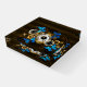 Composition of round steampunk clock with black Roman numeral dial, decorated with gold and brass gears, blue Morpho butterflies and damaged lenses on brown striped background. Steampunk style.