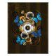 Composition of round steampunk clock with black Roman numeral dial, decorated with gold and brass gears, blue Morpho butterflies and damaged lenses on brown striped background. Steampunk style.