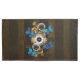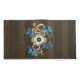 Composition of round steampunk clock with black Roman numeral dial, decorated with gold and brass gears, blue Morpho butterflies and damaged lenses on brown striped background. Steampunk style.