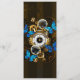 Composition of round steampunk clock with black Roman numeral dial, decorated with gold and brass gears, blue Morpho butterflies and damaged lenses on brown striped background. Steampunk style.