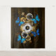 Composition of round steampunk clock with black Roman numeral dial, decorated with gold and brass gears, blue Morpho butterflies and damaged lenses on brown striped background. Steampunk style.