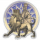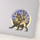 Vintage gold heraldry style lion with added Steampunk style top hat, timepiece and architectural round element in blue