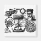 Here is a black and white graphic design featuring the ideals of steampunk or victorian inventions. Add your own text or statement to personalize this wonderful design. Great as a gift for inventors, teachers, scientists, innovators, statement makers, designers and more. Featured are steam powered engine and floating airplane, gears, googled man, lightbulb, typewritter, bicycle, hand and rider, clock and compass.