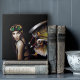 A striking steampunk portrait of a fierce, enigmatic woman transformed into a mechanical fairy. Set against a deep black background, she wears vintage aviator goggles and intricate gear-driven wings that blend delicate butterfly textures with industrial metalwork. Her piercing green eyes and confident pose evoke strength, mystery, and a sense of untold stories. The fusion of organic beauty and mechanical design creates a bold dark fantasy aesthetic, perfect for fans of steampunk, sci-fi elegance, and alternative art styles.