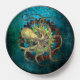 Steampunk inspired industrial rusty clockwork gears, and octopus design on a vibrant blue patina background.