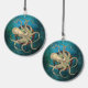 Steampunk inspired industrial rusty clockwork gears, and octopus design on a vibrant blue patina background.