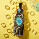 Turquoise lenses with an antique watch with brass gears and golden keys on rusty, brown background. Steampunk style.