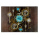 Turquoise lenses with an antique watch with brass gears and golden keys on rusty, brown background. Steampunk style.