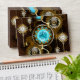 Turquoise lenses with an antique watch with brass gears and golden keys on rusty, brown background. Steampunk style.