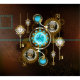 Turquoise lenses with an antique watch with brass gears and golden keys on rusty, brown background. Steampunk style.