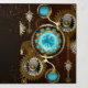 Turquoise lenses with an antique watch with brass gears and golden keys on rusty, brown background. Steampunk style.