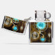 Turquoise lenses with an antique watch with brass gears and golden keys on rusty, brown background. Steampunk style.
