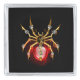 Mechanical, steampunk spider with gold, brass gears and a red glass lamp on a black background. Steampunk style.