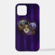 Steampunk spider made of gold and steel with antique watches decorated with gold gears on purple, striped, textured background with lenses and brass gears. Steampunk style.