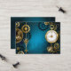 Turquoise, textured, steampunk background with brass and gold gears, a silver key and the clock. Steampunk style.