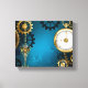 Turquoise, textured, steampunk background with brass and gold gears, a silver key and the clock. Steampunk style.