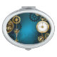 Turquoise, textured, steampunk background with brass and gold gears, a silver key and the clock. Steampunk style.