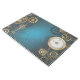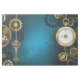 Turquoise, textured, steampunk background with brass and gold gears, a silver key and the clock. Steampunk style.