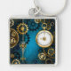 Turquoise, textured, steampunk background with brass and gold gears, a silver key and the clock. Steampunk style.