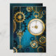 Turquoise, textured, steampunk background with brass and gold gears, a silver key and the clock. Steampunk style.