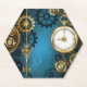 Turquoise, textured, steampunk background with brass and gold gears, a silver key and the clock. Steampunk style.
