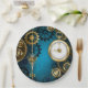 Turquoise, textured, steampunk background with brass and gold gears, a silver key and the clock. Steampunk style.