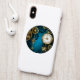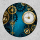 Turquoise, textured, steampunk background with brass and gold gears, a silver key and the clock. Steampunk style.