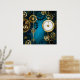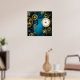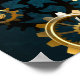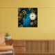 Turquoise, textured, steampunk background with brass and gold gears, a silver key and the clock. Steampunk style.