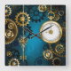 Turquoise, textured, steampunk background with brass and gold gears, a silver key and the clock. Steampunk style.